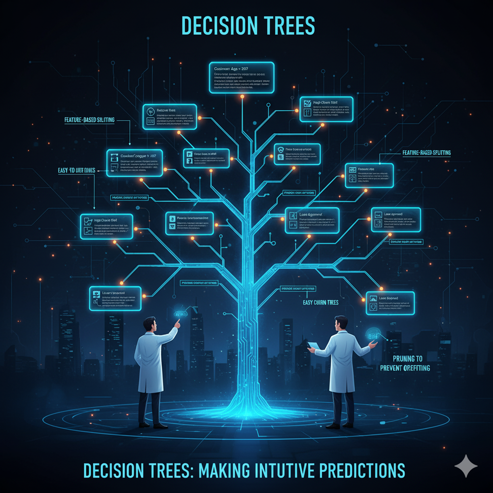 Decision Trees mô phỏng cách con người đưa ra quyết định bằng cách tách dữ liệu thành nhiều nhánh dựa trên đặc trưng. Ưu điểm lớn nhất của thuật toán này là dễ hiểu, trực quan giúp cả những người không chuyên cũng có thể theo dõi mô hình. Tuy nhiên, nếu không được cắt tỉa (pruning) đúng cách, cây quyết định dễ bị overfitting và kém hiệu quả với dữ liệu phức tạp.