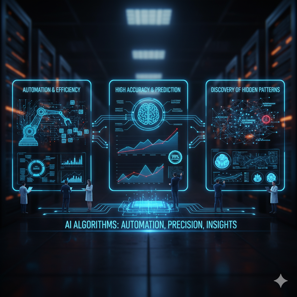 Điểm mạnh lớn nhất của thuật toán AI chính là khả năng tự động hóa những quy trình vốn phức tạp và tốn kém nếu con người thực hiện thủ công. Các mô hình học máy có thể xử lý cùng lúc hàng triệu bản ghi dữ liệu, tối ưu hóa các bước từ phân loại, dự đoán đến ra quyết định mà không cần sự can thiệp liên tục.