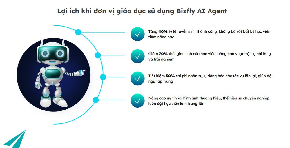 - Nâng cao uy tín thương hiệu: Sự hiện diện của một chuyên gia AI thông minh, phản hồi nhanh chóng và cá nhân hóa giúp nhà trường tạo ấn tượng hiện đại, chuyên nghiệp, rất được lòng thế hệ Gen Z và phụ huynh quan tâm đến công nghệ.