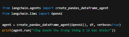 agent = create_pandas_dataframe_agent(OpenAI(temperature=0), df, verbose=True)# Bước 3: Đặt câu hỏi tự nhiên