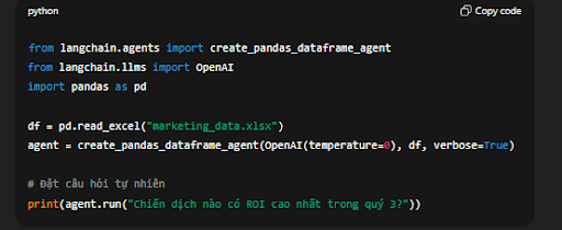 Một ví dụ thực tiễn phổ biến là kết hợp LangChain với Pandas DataFrame Agent. Chỉ vài dòng code, developer đã có thể dựng hệ thống Q&A trực tiếp trên file Excel: