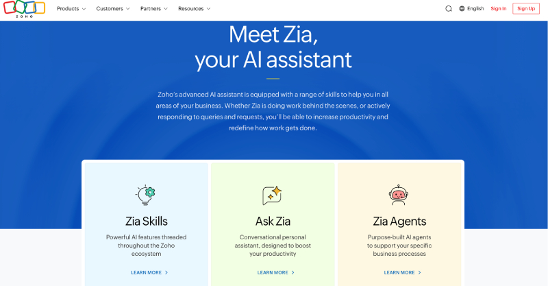 Một trong những tính năng nổi bật nhất của Zoho CRM chính là Zia AI, trợ lý ảo được tích hợp sẵn trong hệ thống. Zia có khả năng dự đoán xu hướng bán hàng, tự động chấm điểm lead (lead scoring) và gợi ý hành động tiếp theo cho đội ngũ sales.